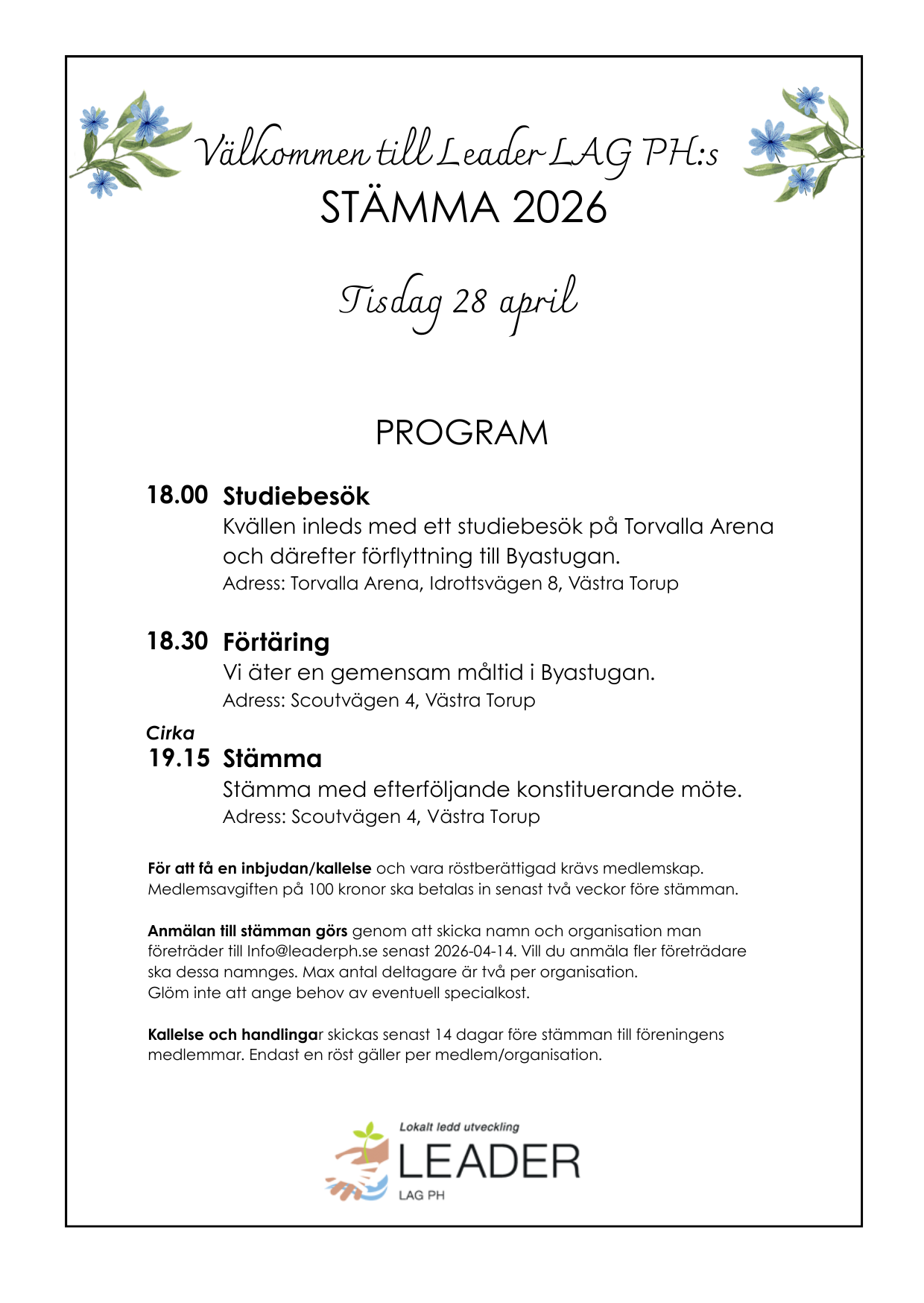 Anmälan sker genom att du skickar ett mail till info@leaderph.se senast den 14 april. Ange ditt namn samt namnet på organisationen som du företräder. På grund av möteslokalens storlek gäller max 2 anmälda per organisation. Vill du anmäla ytterligare en representant namnges även denna i din anmälan.